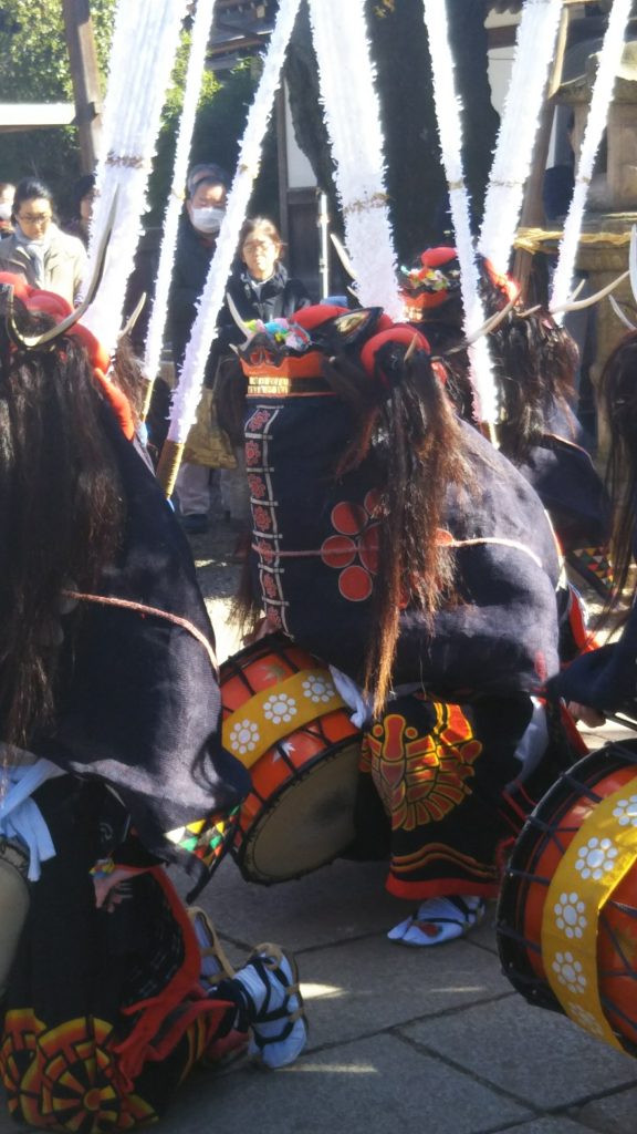 手前には鬼の衣装の被り物をまとった鬼が目の前に大勢