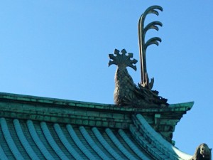 寺の入口の屋根瓦の上には天高く届けとばかり竜らしき像が