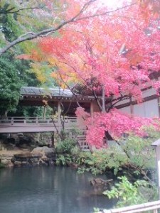 池とお寺の建物、そして、池に映るもみじの色鮮やかな色彩。