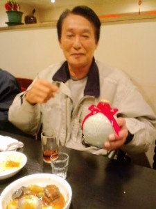 ろうそくを点火してのお祝いのろうそく消し。ろうそくの光りと小生の頭の光り、どちらが賑やかでしょうか。