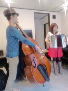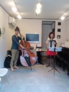 ベースとアコーデオンの組み合わせのライブ。昔からの友人から電話があり、関西で路上で演奏してる彼らが東京でCDの録音のために上京するので、どこか場所を提供してくれないかの頼みに、弊社のギャラリーを貸しました。