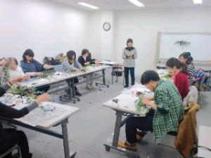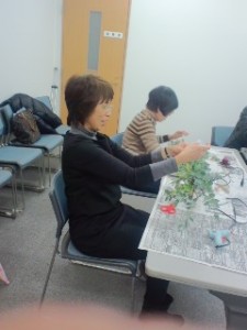 10名ほどの女性が先生の指示の元、お花の創作をしてます。