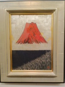 鮮やかな赤の色で人物、風景を表現。赤富士が雲の上にその下には湖、森、、、