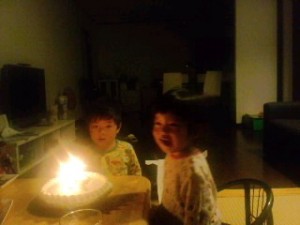 実は1歳の孫の誕生日。早速 お兄ちゃんが一緒にろうそくに向かって、、、、
