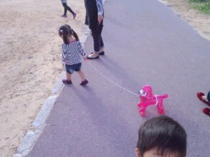 ?お気に入りのワンワンチャン。ビニーイルでのおもちゃを紐で引っ張ってどこまでも離しません。