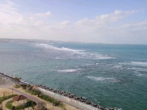 ?ホテルのベランダから眺める沖縄の海。青い海の上に白波がところどころに波立ってます。